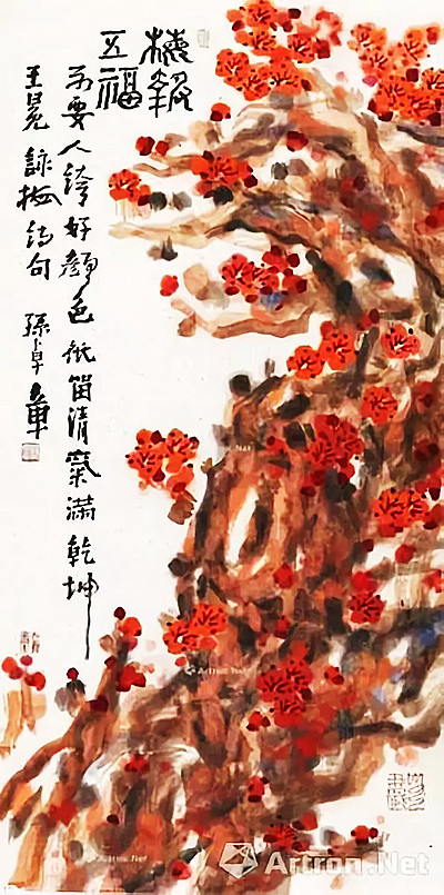 孫卓章先生在此次拍賣活動中有兩件近年創(chuàng)作的新作品參拍,經(jīng)過藏家激烈競拍國畫作品《梅報五?!纷罱K以RMB115,000成交,書法作品《大學(xué)》語成交價RMB57,500。